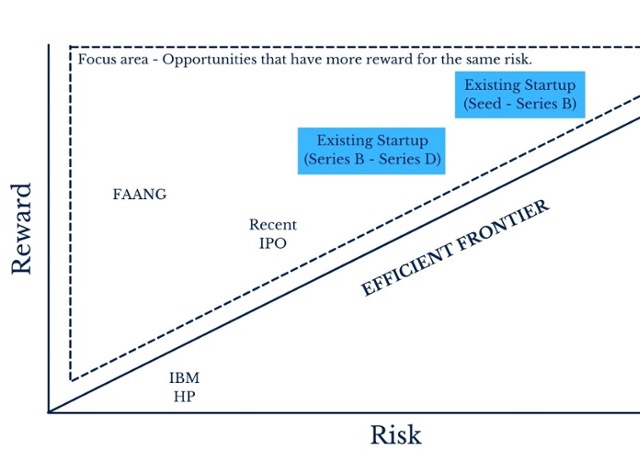 The graph above is a simple risk-reward spectrum. As you can see, roles at different stage companies all have their own ratio of risk to reward and there are a number of factors that determine which side of the Efficient Frontier line it is on.